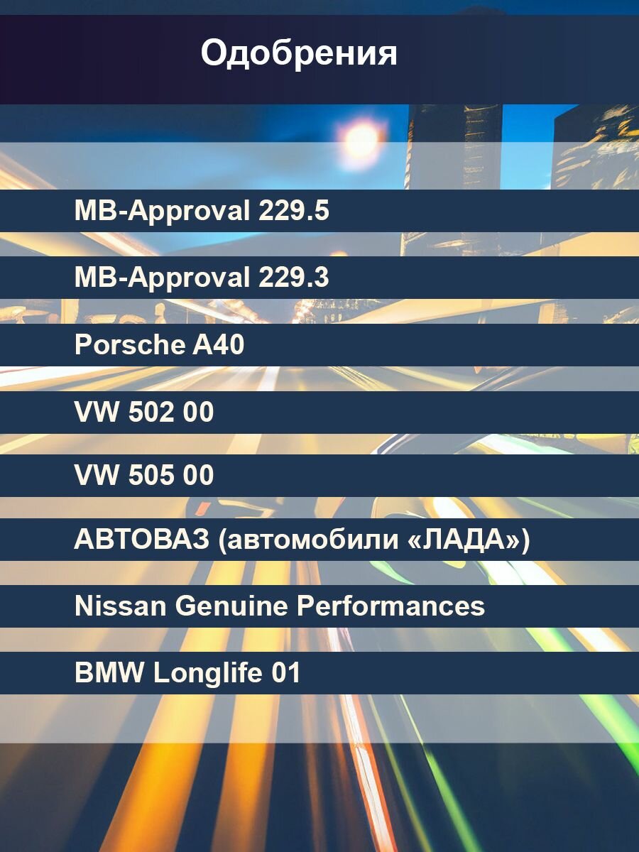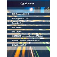 | Допуски OEM | AAE (STO 003) Group B7, BMW Longlife-01, FIAT 9.55535-M2, FIAT 9.55535-N2, FIAT 9.55535-S2, FIAT 9.55535-Z2, Ford WSS-M2C 917-A, Ford WSS-M2C 937-A, GM Dexos 2, GM-LL-A-025, GM-LL-B-025, MB 226.5, MB 229.1, MB 229.3, MB 229.31, MB 229.5, MB 229.51, MB 229.52, PORSCHE A40, PORSCHE C30, Renault RN 0700, Renault RN 0710, VW 502.00, VW 502.00/505.00, VW 503.01, VW 505.00, VW 505.01, ПАО "Автоваз" |