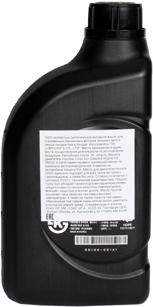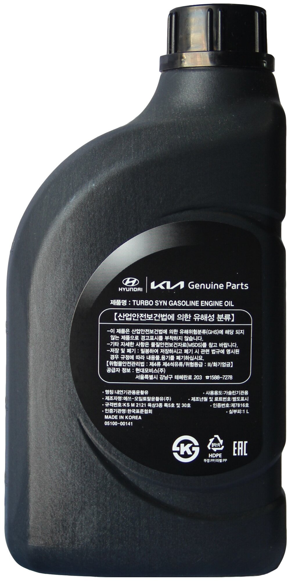 Технические характеристики масла Hyundai 5W30 Turbo Syn Gasoline Engine OIL Продукт Turbo Syn обладает превосходными характеристиками, среди которых отличные вязкостно-температурные, моющие, защитные и многие другие. Масло Hyundai сохраняет свои свойства при самых высоких температурах, а также не теряет качеств при низких. Обеспечивая тем самым очень легкий запуск двигателя в холодное зимнее время. Надежно защищает детали мотора от износа в широком диапазоне температур на протяжении всего срока службы от замены до замены. Способствует экономии топлива. Поддерживает двигатель в чистоте, продлевает рабочий ресурс деталей. Совместимо с самыми современными системами очистки отработавших газов.