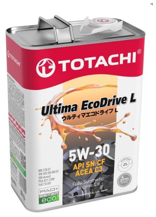 TOTACHI ULTIMA ECODRIVE L 5W30 – полностью синтетическое (ПАО + эстеры) моторное масло с высокими рабочими характеристиками, разработанное для использования в современных бензиновых и дизельных двигателях, оснащенных современными системами контроля эмиссии.