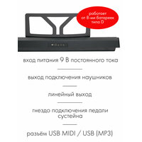Разъемы подключения внешних устройств: вход питания, линейный выход, выход подключения наушников, гнездо подключения педали сустейн, разъем USB MIDI, разъем USB (MP3).