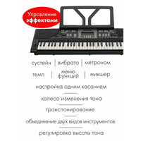 Управление эффектами: два инструмента, сустейн, вибрато, настройка одним касанием, чувствительность к силе нажатия, транспонирование, темп, метроном, меню функций, микшер, колесико настройки, регулировка высоты тона.