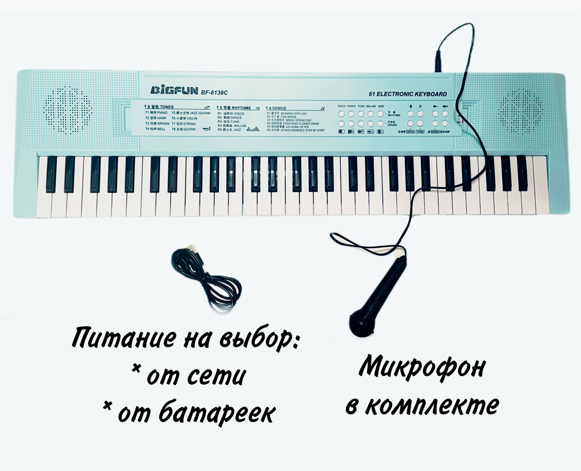 Детский синтезатор с микрофоном. Детское пианино оснащено микрофоном (микрофон расположен с задней части синтезатора), имеет 61 клавишу, 5 ритмов, 8 тонов, 6 Демо мелодий, 5 ударных музыкальных инструментов. Возможность питания и от сети( в комплекте провод USB) и от батареек ( для работы необходимо 3 батарейки типа АА, в комплект не входят). Функция записи и воспроизведения, регулировка громкости и ритма. У синтезатора моно динамик, второй динамик - муляж. Размер синтезатора - 62.5х16.5 см. Игрушечные инструменты привьют интерес к музыке. Занятия с инструментом способствуют развитию музыкального, визуального восприятия, мелкой моторики, воображения и памяти. Малыш будет нажимать на клавиши, слушать интересные мелодии и звуки. Вместе с ребёнком изучайте ноты в игровой форме, придумайте сюжет для увлекательных занятий.