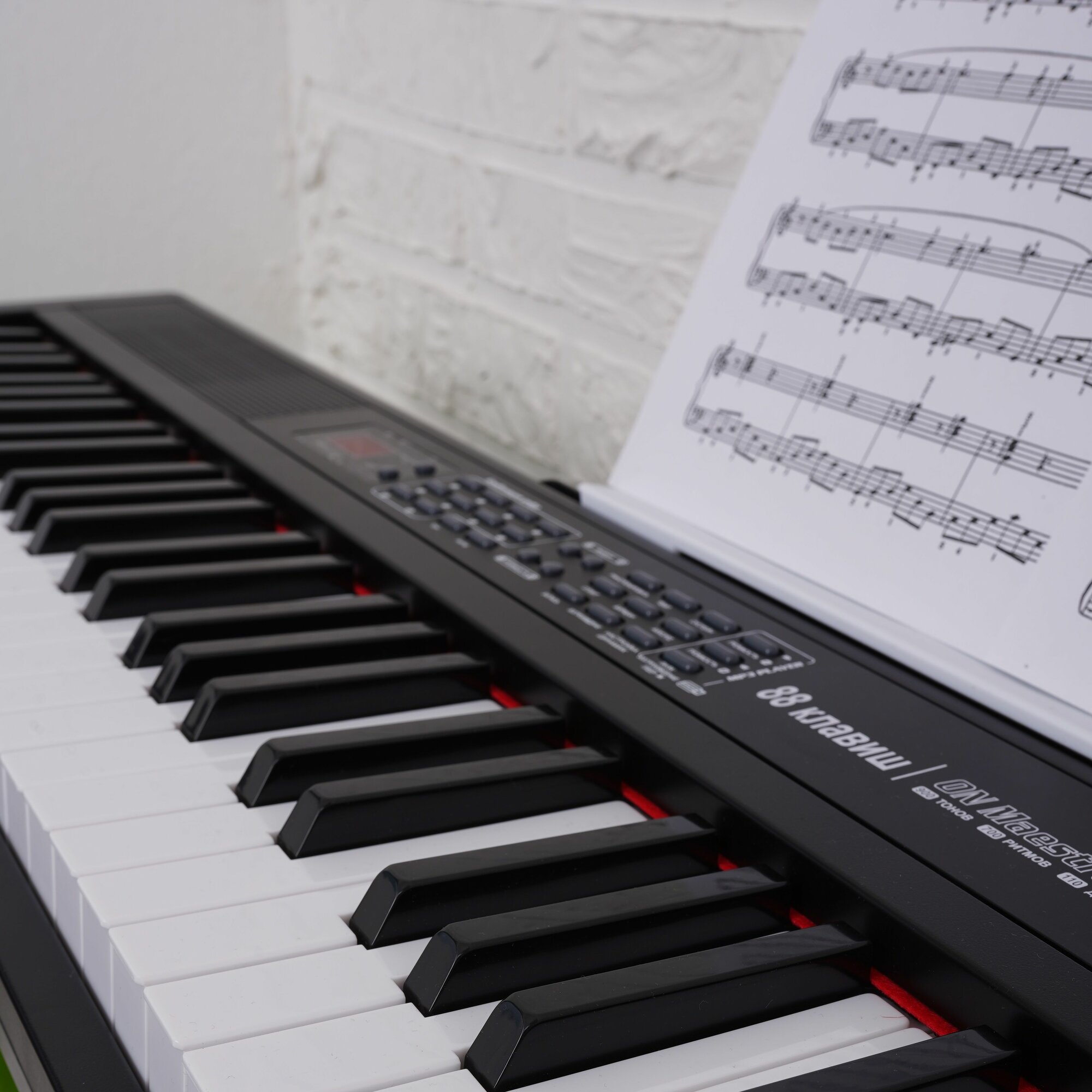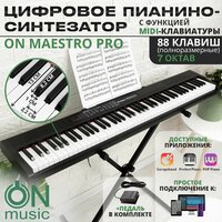 Цифровое пианино-синтезатор ON Maestro Pro-это высококачественный музыкальный инструмент, который сочетает в себе функции синтезатора и MIDI-клавиатуры. Электронное музыкальное напольное/настольное обучающее пианино ON Maestro Pro оснащен активной клавиатурой на 88 клавиш, которая обеспечивает максимальное сходство с настоящим пианино, усиливает ощущение прикосновения и обеспечивает функцию отклика на силу прикосновения. Благодаря этому, вы сможете наслаждаться игрой на инструменте. Размеры клавиш: Белых-ширина 22 мм, длина 130 мм; Черных-ширина 10 мм, длина 82 мм Этот профессиональный синтезатор оснащен различными цифровыми функциями, которые делают его удобным и функциональным музыкальным инструментом, включая запись и воспроизведение записанного исполнения, регулировку громкости клавиатуры и аккомпанемента и многое другое. Встроенные 700 ритмов, 900 тембров и 110 предустановленных песен позволяют использовать его как для обучения игре на пианино, так и для профессионального использования. Синтезатор оснащен мощными двухполосными динамиками, которые обеспечивают чистое и ясное звучание. Вы также можете подключить его к USB-флешке для воспроизведения собственных стилей и песен, или использовать Bluetooth для синхронизации с приложениями для обучения на телефоне. Кроме того, инструмент имеет множество дополнительных особенностей, таких как дисплей, клавиши с имитацией дерева, подключение к усилителю или колонкам, подключение наушников, подключение микрофона, подключение педали Sustain, подключение MIDI к компьютеру и многое другое. В комплекте с инструментом идет педаль сустейна, блок питания. Также вы можете использовать его от аккумулятора/4х батареек АА (в комплект не входит), что делает его удобным для использования в любом месте. В целом, синтезатор 88 клавиш ON Maestro Pro-это многофункциональный инструмент, который подойдет как для начинающих, так и для профессионалов. Отличный подарок, чтобы порадовать ваших близких на праздник или просто так!