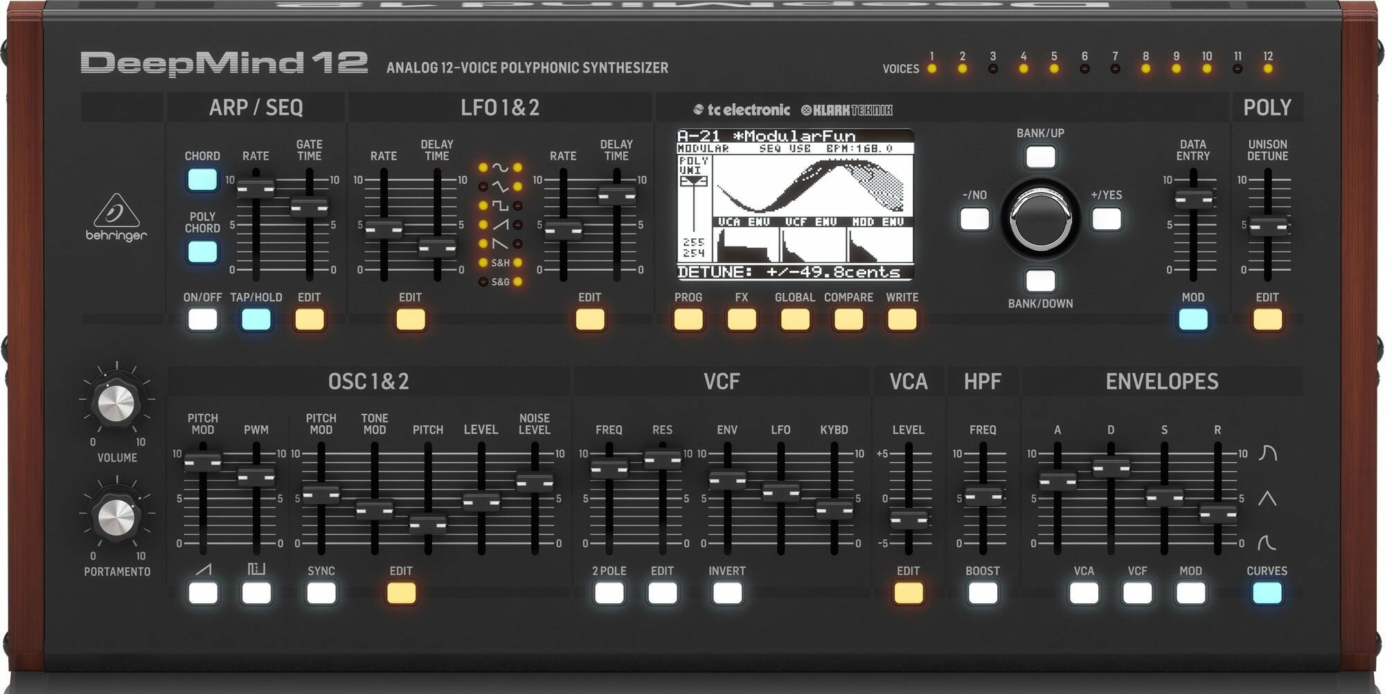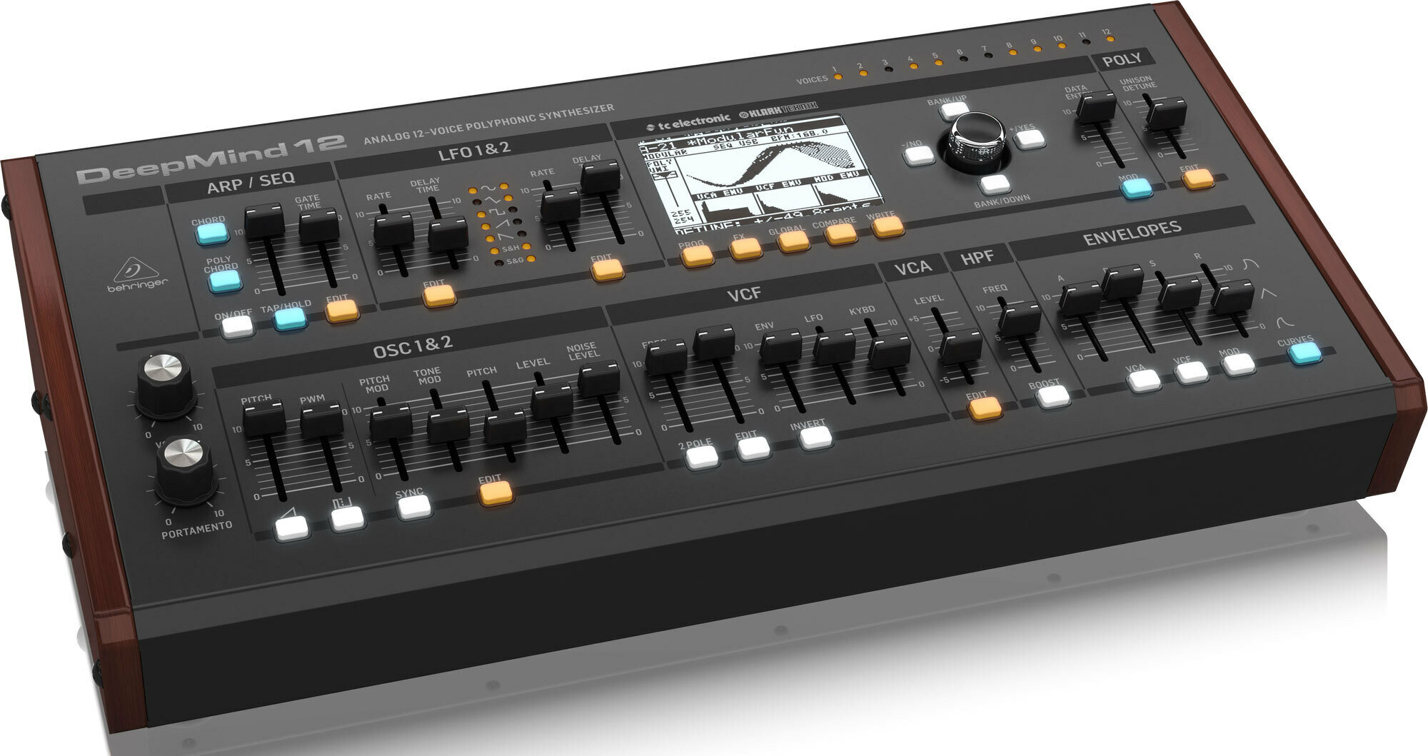 DEEPMIND 12D представляет собой аналоговый, 12-голосый полифонический синтезатор, созданный компанией Behringer в качестве удобной настольной версии ранее выпущенного DEEPMIND 12. DEEPMIND 12D реализован с использованием сложных технических схем. Это позволяет ему модулировать практически любой звук, который только можно себе вообразить, с непревзойденной утонченностью и легкостью. Благодаря 4 FX движкам, двум аналоговым OSC и LFO на голос, 3 генераторам ADSR, 8-канальной матрице модуляции и встроенному 32-шаговому регулируемому секвенсеру, DEEPMIND 12D предоставляет полный контроль над вашим звуковым ландшафтом. Кроме того, DEEPMIND 12D предлагает полноценное дистанционное управление через iPad/PC/Mac и приложения Android через USB или MIDI или встроенный WiFi - для индивидуального рабочего процесса, который позволяет вашему творческому настрою взмыть к новым вершинам.