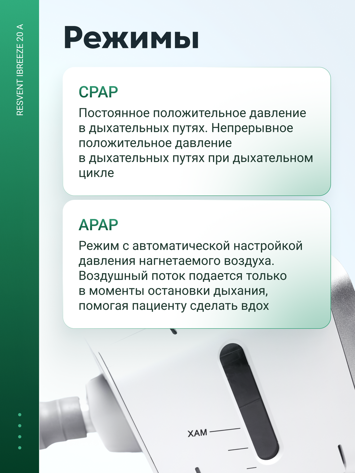 Принцип работы: устройство подает положительное или отрицательное давление в дыхательные пути, расширяя просвет и предотвращая остановку дыхания.