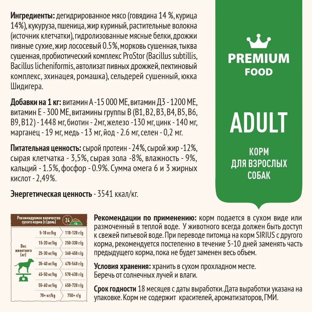 SIRIUS — сухой корм премиум класса для полноценного ежедневного рациона взрослых собак. Высокое содержание мясных ингредиентов обеспечивает оптимальный уровень белка и укрепляет мышцы. Баланс витаминов и комплекса пробиотиков 4-го поколения PROSTOR+ нормализует пищеварение и укрепляет иммунитет. Омега 3 и Омега 6 способствуют поддержанию здоровья сердца, мозга, нервной системы, здоровья кожи и красоты шерсти.