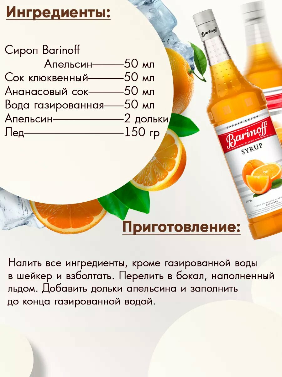 Купить Сироп Barinoff «Апельсин» пастеризованный, для алкогольных и безалкогольных коктейлей, кофе, пирожных, мороженого, 1 л. с доставкой по всей России. Сироп Barinoff «Апельсин» пастеризованный, для алкогольных и безалкогольных коктейлей, кофе, пирожных, мороженого, 1 л.: сравнение цен, характеристики, фото, актуальное наличие и цены.