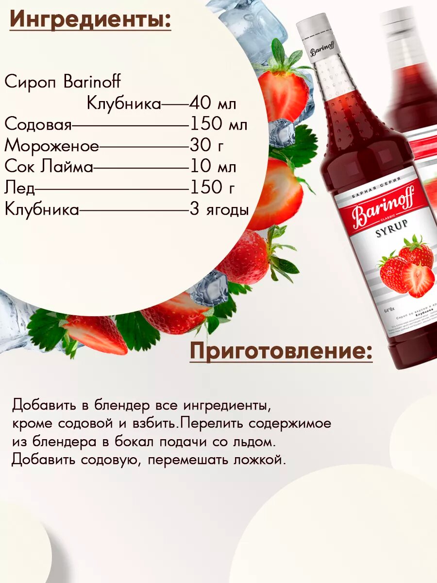Купить Сироп Barinoff «Клубника» пастеризованный, для алкогольных и безалкогольных коктейлей, кофе, пирожных, мороженого, 1 л. с доставкой по всей России. Сироп Barinoff «Клубника» пастеризованный, для алкогольных и безалкогольных коктейлей, кофе, пирожных, мороженого, 1 л.: сравнение цен, характеристики, фото, актуальное наличие и цены.