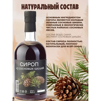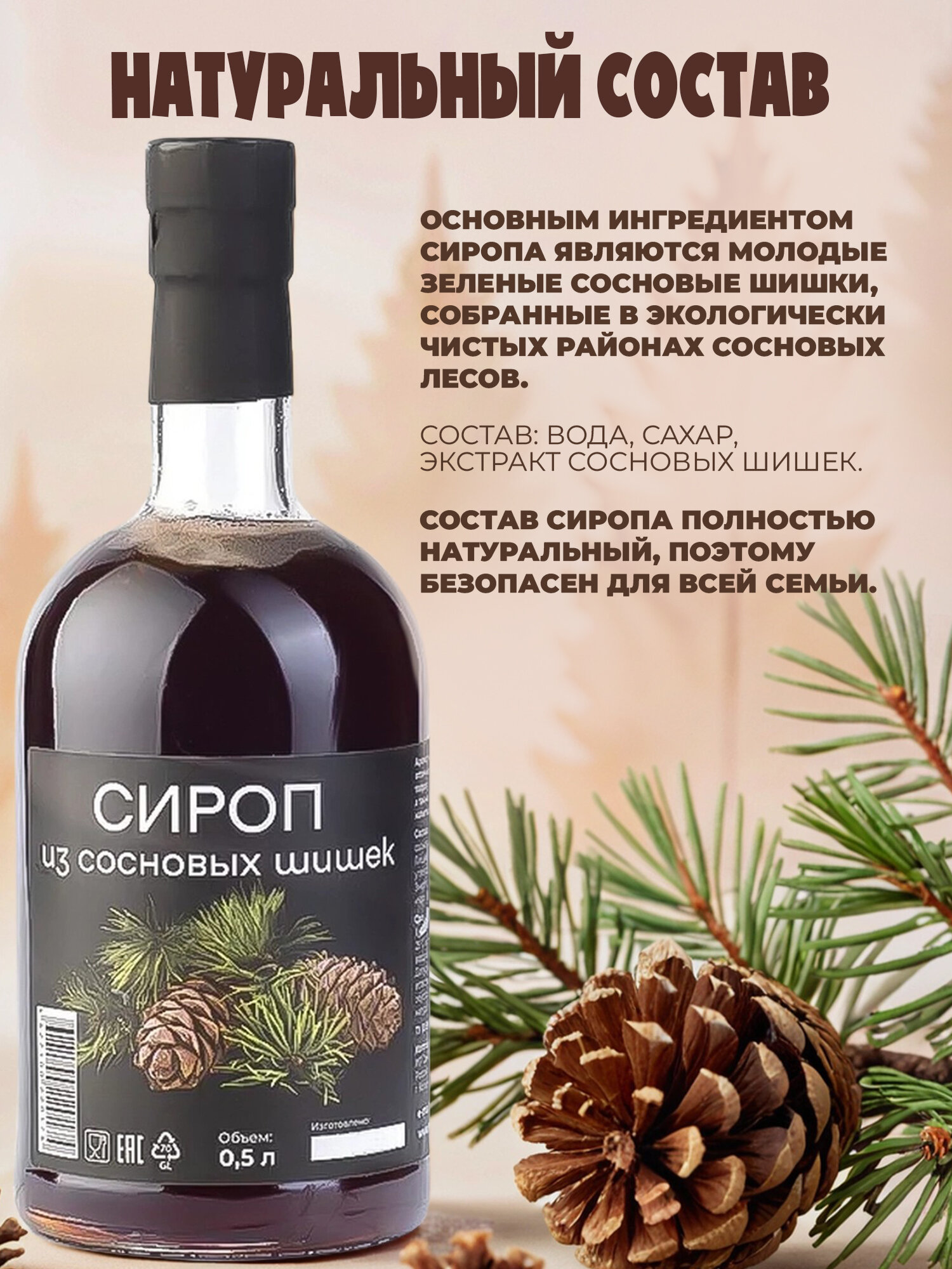 В составе сиропа только натуральные ингредиенты: сосновые шишки, сахар и вода. Благодаря этому, сироп является безопасным и полезным для здоровья продуктом.