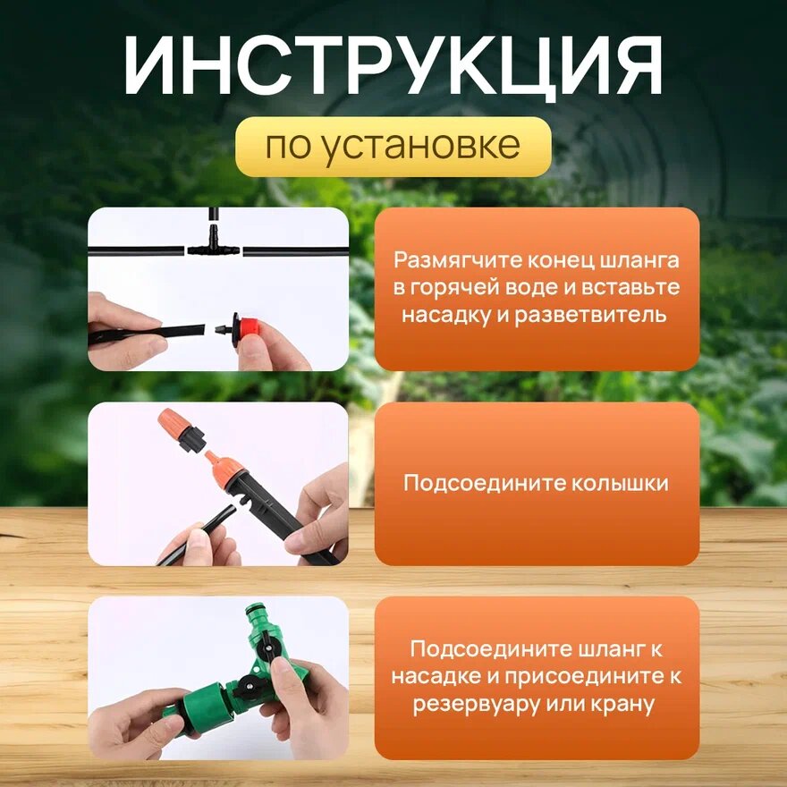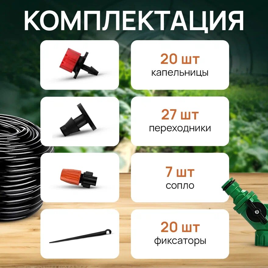 Система универсальна и ее можно подстроить под конкретные нужды. В комплекте шланг 40 м, крепления и несколько типов насадок. Вы можете сами распределить систему на области, которая требует полива. Вы также можете выбрать нужный тип насадки: для распыления, опрыскивания или капельного полива.