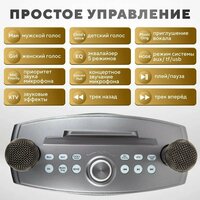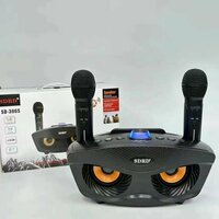 Премиальная портативная караоке система SD-306 Plus имеет привлекательный дизайн, напоминающий взгляд совы, удобную сенсорную панель управления, подставку для смартфона/планшета и держатели для беспроводных микрофонов. Данная модель отлично подходит как взрослым, так и детям. Её можно использовать как дома, так и брать с собой куда угодно, даже на природу, так как она полностью портативная и беспроводная. Время работы аккумулятора — до 7 часов. Для воспроизведения музыки подключите по Bluetooth смартфон к системе, откройте на телефоне любую музыку или готовые караоке песни на Youtube — и эта музыка будет проигрываться через встроенные колонки караоке системы. Еще в этой модели предусмотрели изменение частот на микрофонах, с помощью этой функции вам не страшны помехи и искажение от других источников. Вы всегда сможете подобрать лучший канал связи.