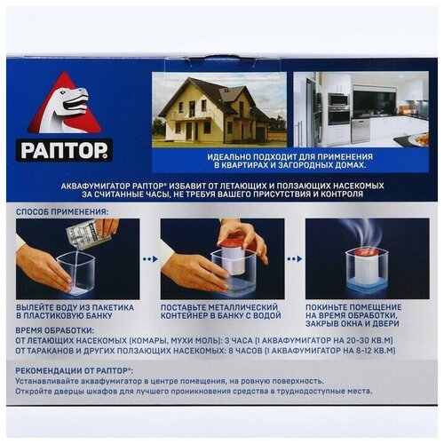 Аквафумигатор Раптор - эффективное средство для уничтожения различных насекомых в жилых и служебных помещениях разных типов. Прост и безопасен в применении. В основе препарата японское действующее вещество цифенотрин, доказавшее свою эффективность в отношении борьбы с насекомыми. В то же время - при соблюдении ряда мер безопасности - оно совершенно безвредно для домашних животных. Для активации прибора потребуется немного воды, и прибор можно использовать. При контакте действующего вещества, заключенного в металлический контейнер, с водой, образуется пар.