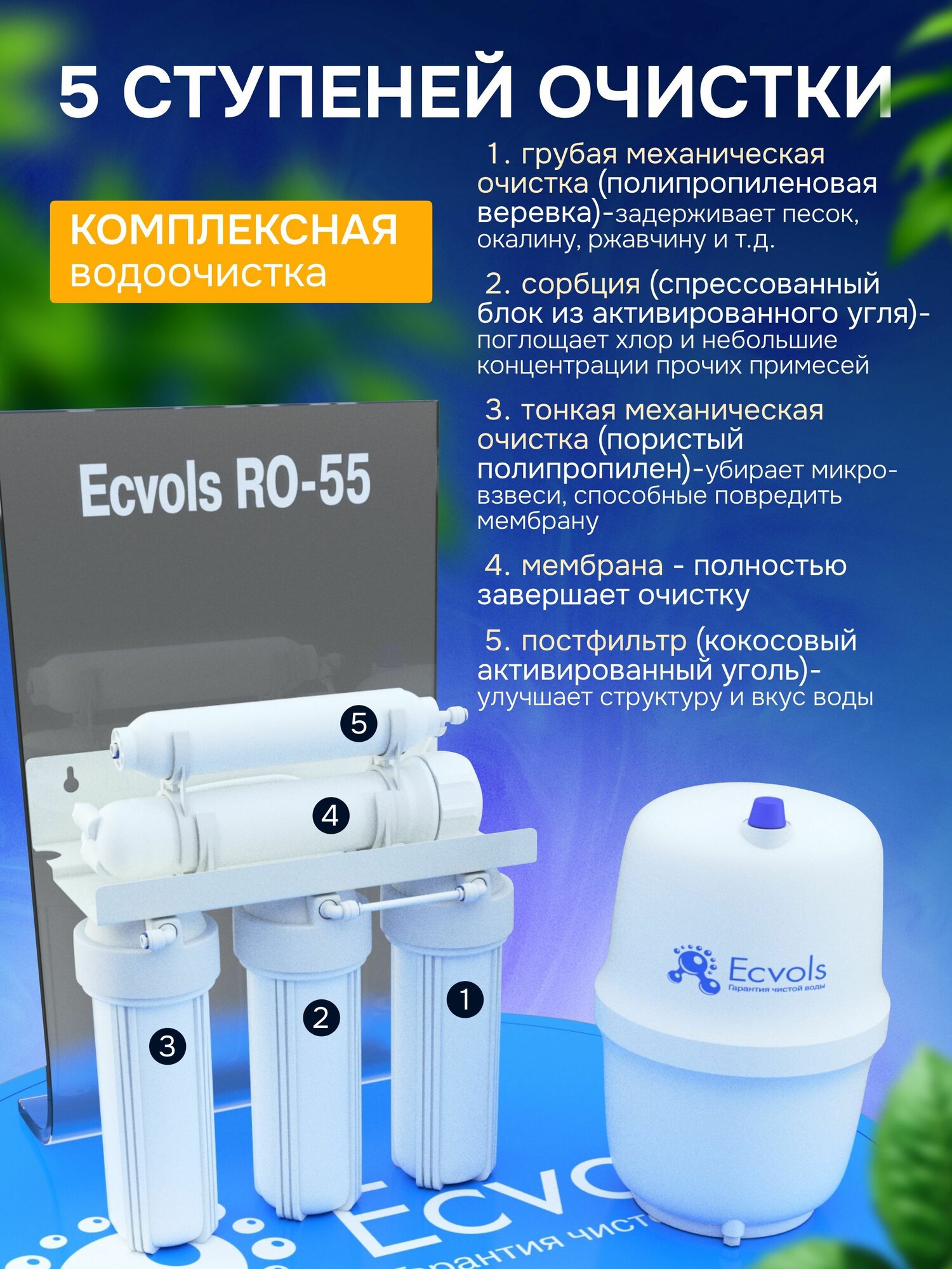 Система обратного осмоса Ecvols RO-55, 5 ступеней, бак 10 л, очистка 99.9%: сравнение цен, характеристики, фото, актуальное наличие и цены.