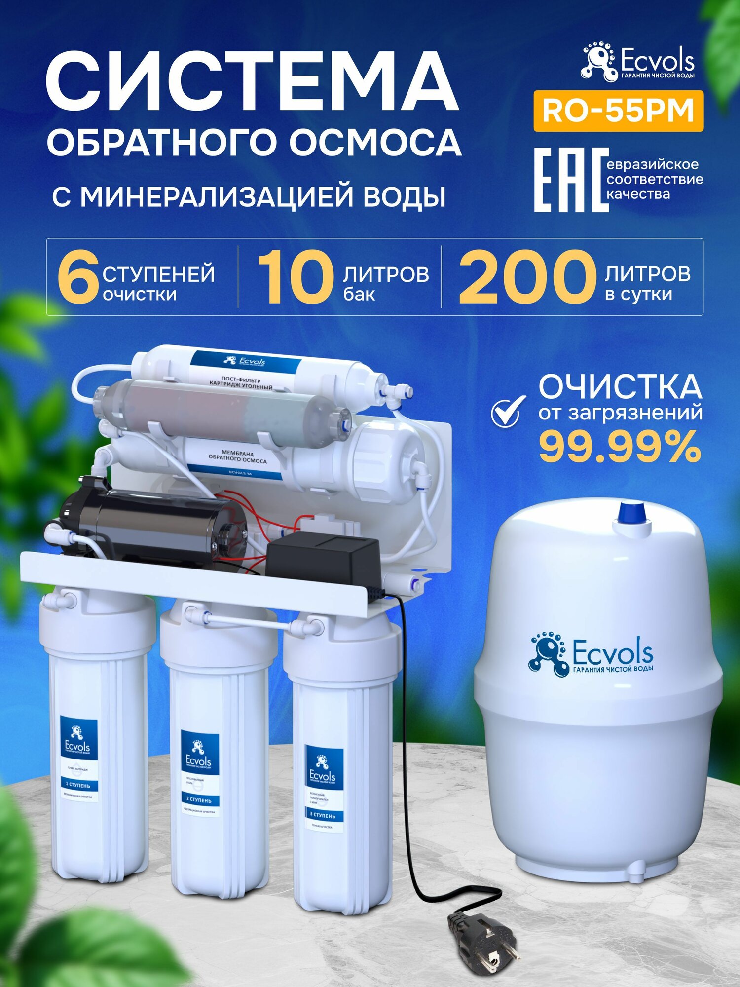Купить Система обратного осмоса Ecvols RO-55PM, фильтр обратного осмоса 6 ступеней очистки, бак 6 л, очистка 99,9% с доставкой по всей России.