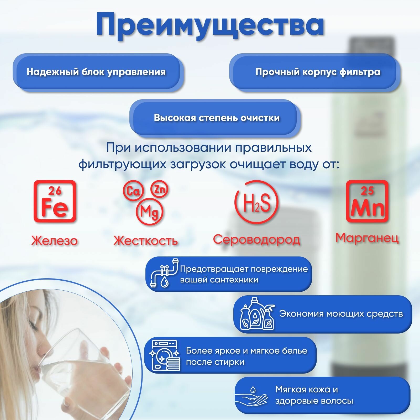2. В то время, как вода проходит фильтрацию, автоматический блок управления Runxin F117Q3 считывает объем пройденной воды и согласно заданным параметрам по объему пройденной воды блок запустит регенерацию в установленное время. Для корректной промывки в солевом баке всегда должна находиться таблетированная соль. Система очистки воды DS Soft 1252 - это комплексное решение для обеспечения чистой и безопасной воды в вашем доме или на даче. Она предназначена для очистки воды из скважины, колодца или водопровода, включая функцию умягчения и обезжелезивания.