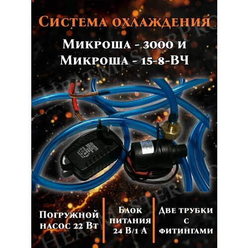 Простейший вариант охлаждения индуктора для аппаратов МИКРОША-3000, МИКРОША-15-8-ВЧ/СЧ состоит из погружного насоса мощностью 22 Вт на напряжение 24 вольта с блоком питания 24В/1А и двумя трубками. Насос опускается в любую подходящую по объему емкость: ведро, канистру, бочку и т. п. Трубка подачи воды подсоединяется к одному концу трубки индуктора, обратная трубка - к другому концу и сливается назад в бочку.