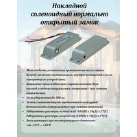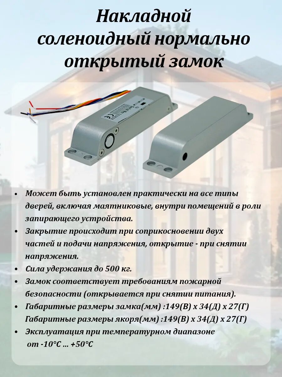 Замок электрический, ригельный замок, электронный. Комплект системы контроля управления доступом ( СКУД) с ригельным замком для самостоятельной установки практически на все типы дверей, включая маятниковые, внутри помещений в роли запирающего устройства. В комплекте замок ригельный, сила удержания до 500 кг. Замок состоит из двух частей корпусной (электромагнита) и ответной (якоря), закрытие происходит при соприкосновении двух этих частей и подачи напряжение, открытие - при снятии напряжения. Кодовая, влагозащищеённая клавиатура с контроллером и WiFi . Удалённое конфигурирование через приложение Smart Lifi. Контроллер может работать с разными замками. Память рассчитана на 1000 ключей, что удобно для больших предприятий и компаний. В комплекте идет инструкция по работе с ним, поэтому проблем с настройкой возникнуть не должно. Блок питания на 3А с удобным разъемом питания. Брелок EM-Marin - 10шт. В наборе есть все необходимое для самостоятельного подключения, Вам останется докупить только кабель для подключения.