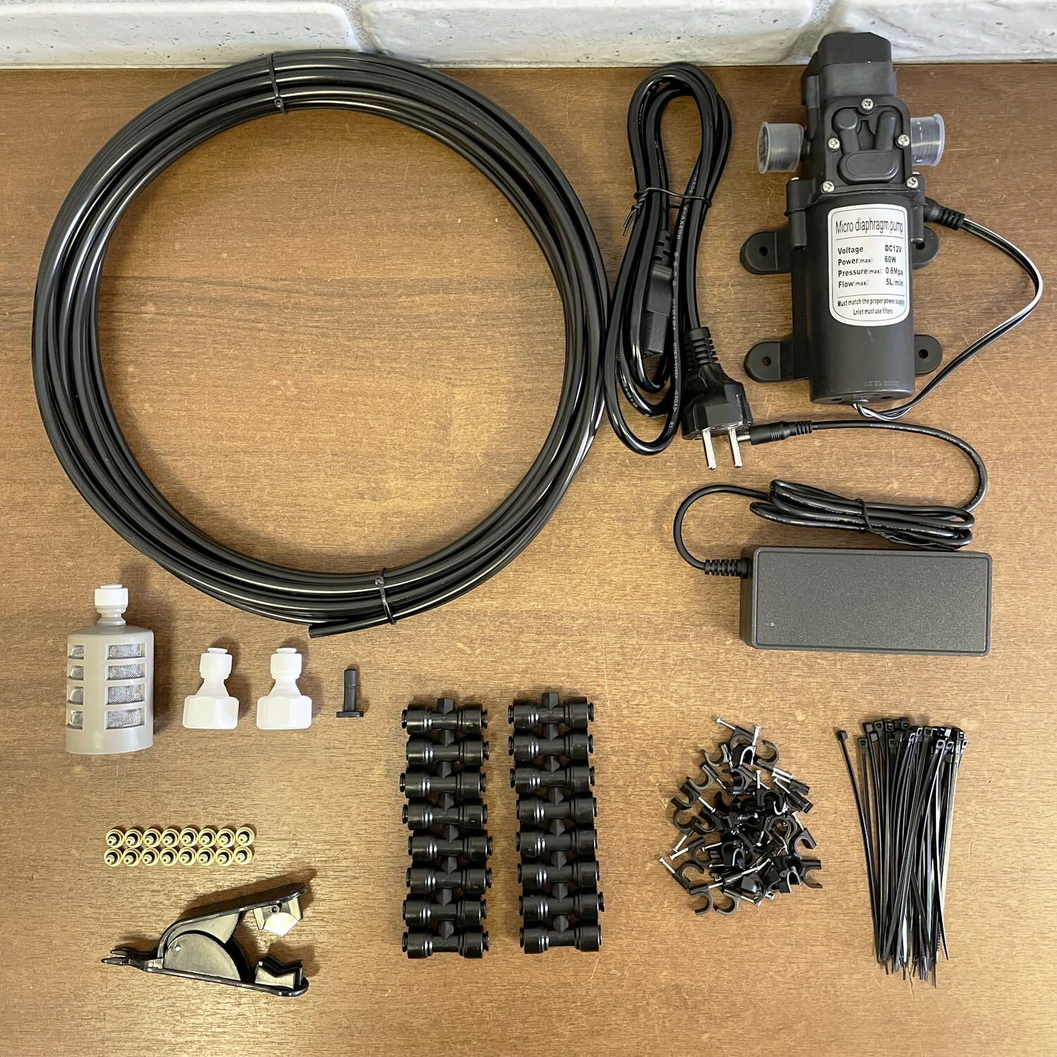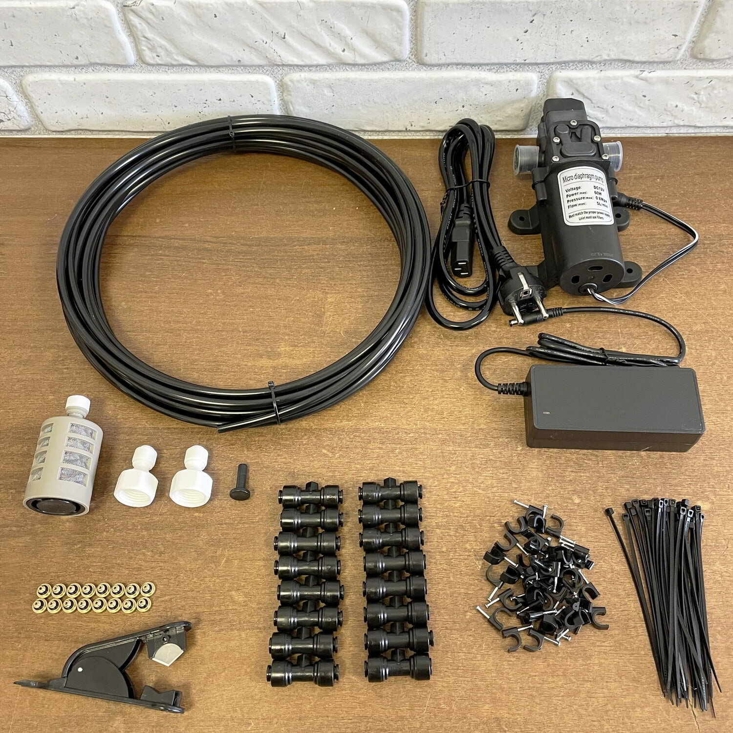 - Полный набор для работы системы от емкости. Вам не придется ничего докупать – в комплекте 16 распылительных форсунок, насос, трубки и все необходимое для подключения, установка системы не займет много времени. Шланг можно просто опустить в воду.