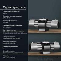 Технические характеристики: - Производительность: 4 м³/ч (4000 литров в час) - Точность фильтрации: 0,01 микрон - Рабочее давление: 0,1-0,4 МПа (1-4 атмосферы) - Температурный режим: от +5°C до +38°C - Срок службы мембраны: до 3 лет - Диаметр подключения: 1 дюйм - Габариты: 806×290×316 мм - Вес системы: 22 кг - Автономная работа: до 48 часов (встроенный аккумулятор)
