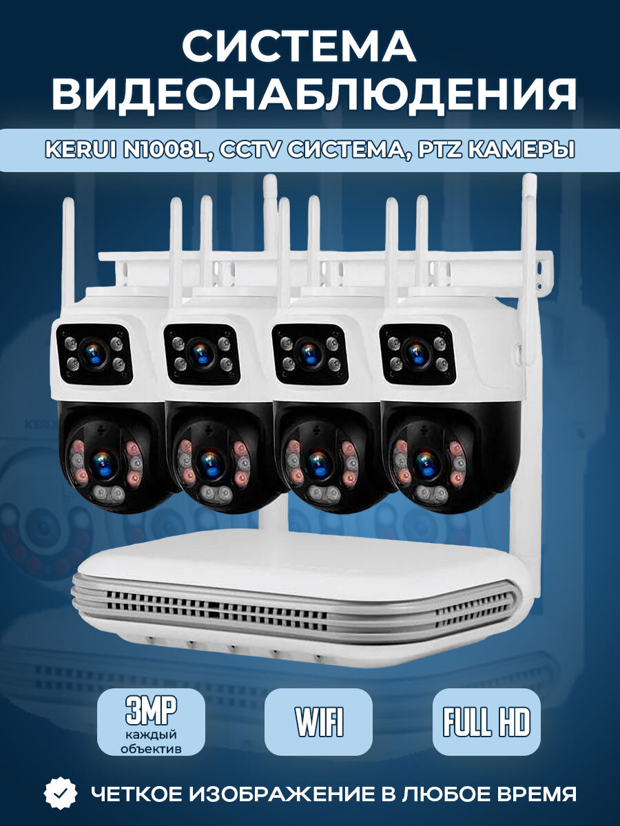 Система видеонаблюдения Kerui N1008L, CCTV система, PTZ камеры, 4 камеры с двойным объективом по 3 МП, без жесткого диска: сравнение цен, характеристики, фото, актуальное наличие и цены.