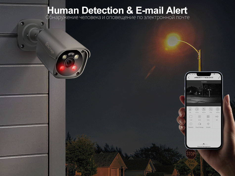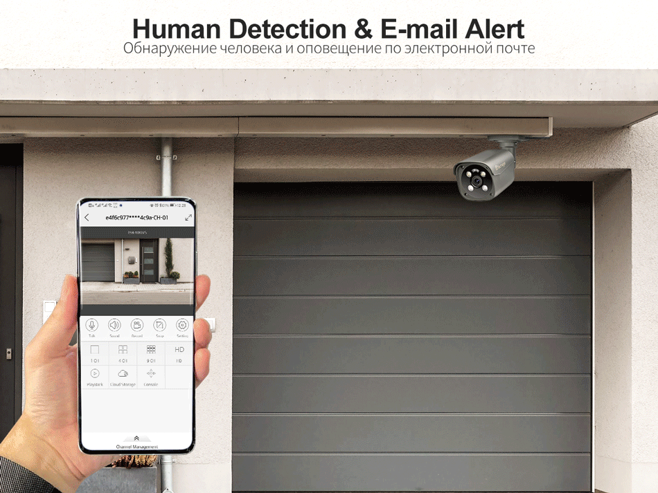Обнаружение человека и интеллектуальные оповещения по электронной почте Когда кто-то попадает в зону съемки, в приложение вашего телефона будут отправлены тревожные сообщения с камеры.