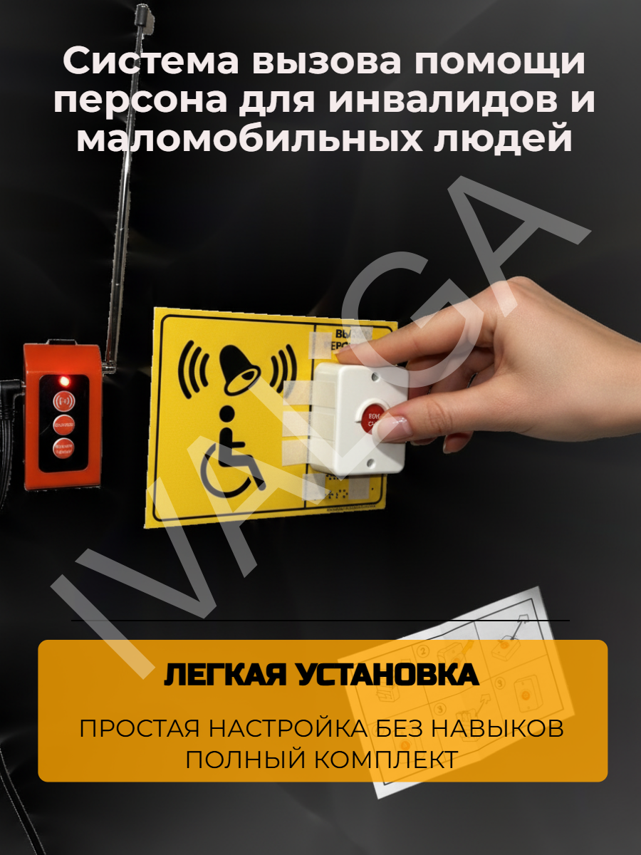 Комплектация: 1. Кнопка вызова помощи Y510 - 1 штука; 2. Тактильная пиктограмма со шрифтом Брайля 200х150мм - 1 штука; 3. Приемник сигнала вызова R15 - 1 штука; 4. Блок питания для приемника сигнала вызова помощи - 1 штука;
