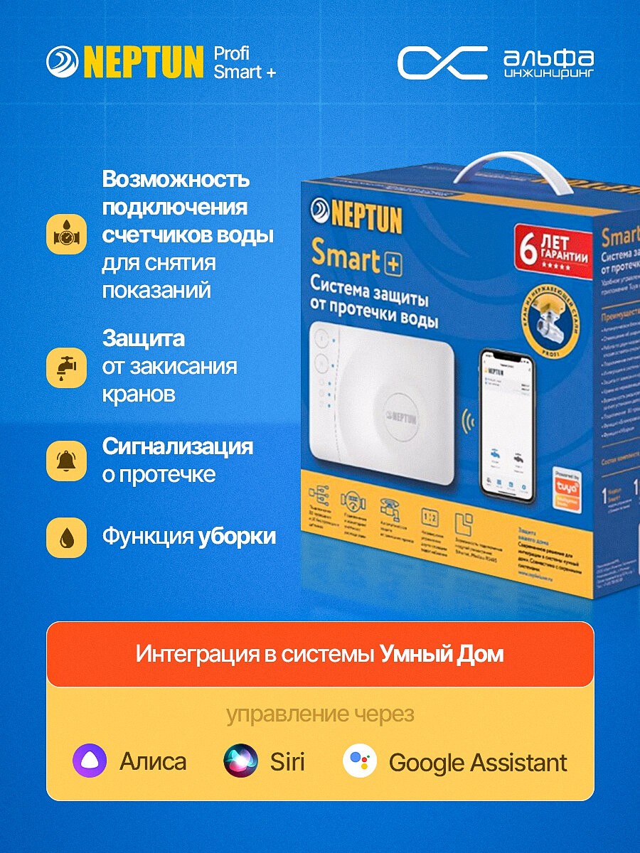 | Подробная комплектация | Модуль управления Neptun Smart+ Tuya, Кран с электроприводом Neptun PROFI 12В 1/2 - 2 шт, Датчик контроля протечки воды SW005 - 1 шт., Радиодатчик Neptun Smart 868 - 2 шт |