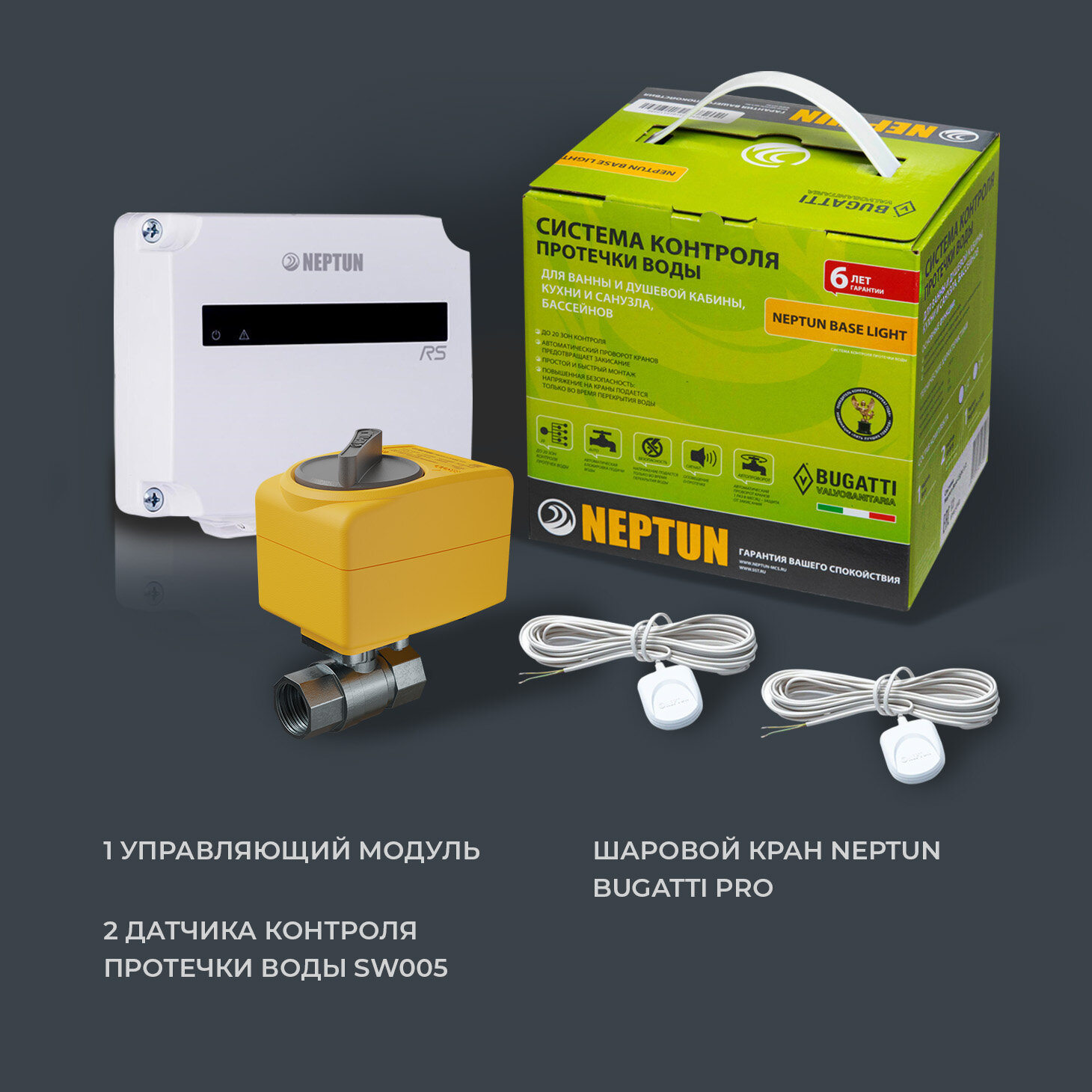 Подробная комплектация включает модуль управления Neptun Base, два датчика Нептун SW 005 и один кран шаровый с электроприводом Bugatti Pro ½. Крутящий момент крана составляет 9 Н*м.