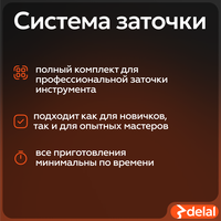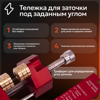В состав системы входят трафарет, фиксатор угла заточки и тележка для заточки. Трафарет позволяет определить угол заточки вашего инструмента, а фиксатор угла заточки обеспечивает надежную фиксацию стамески или лезвия под выбранным углом. Тележка для заточки обеспечивает ровное скольжение лезвия по точильному камню без люфтов и отклонений.