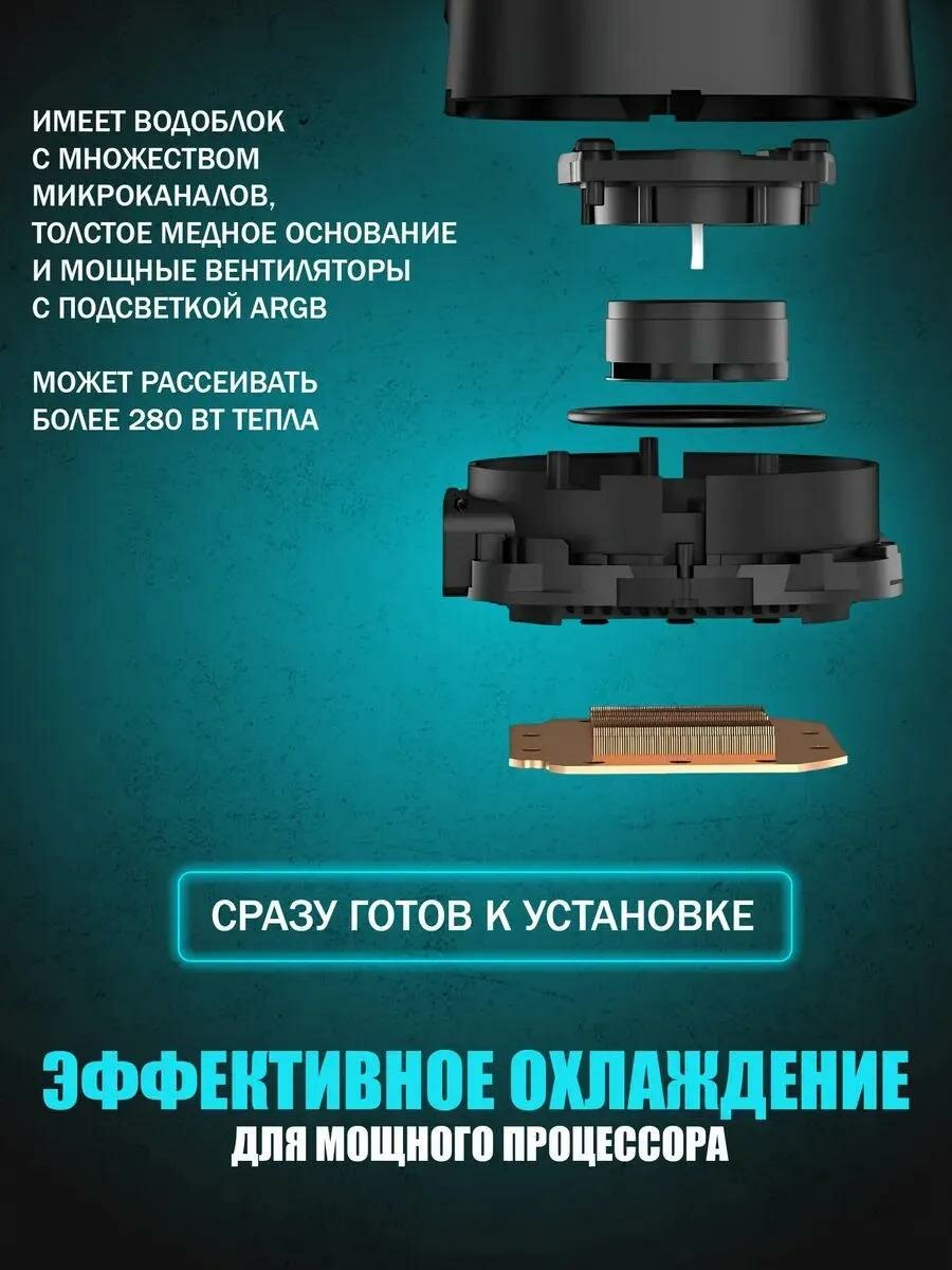 Система состоит из медного водоблока, двухсекционного алюминиевого радиатора и трех вентиляторов 120 мм. Такая конструкция гарантирует стабильное отведение тепла при разных вычислительных нагрузках на процессор. Вентиляторы имеют регулируемую скорость вращения в пределах 500-2250 об/мин, гидродинамический подшипник и низкий уровень шума 32.9 дБ. Интегрированные светодиоды ARGB создают эффектное освещение с настраиваемой палитрой оттенков.