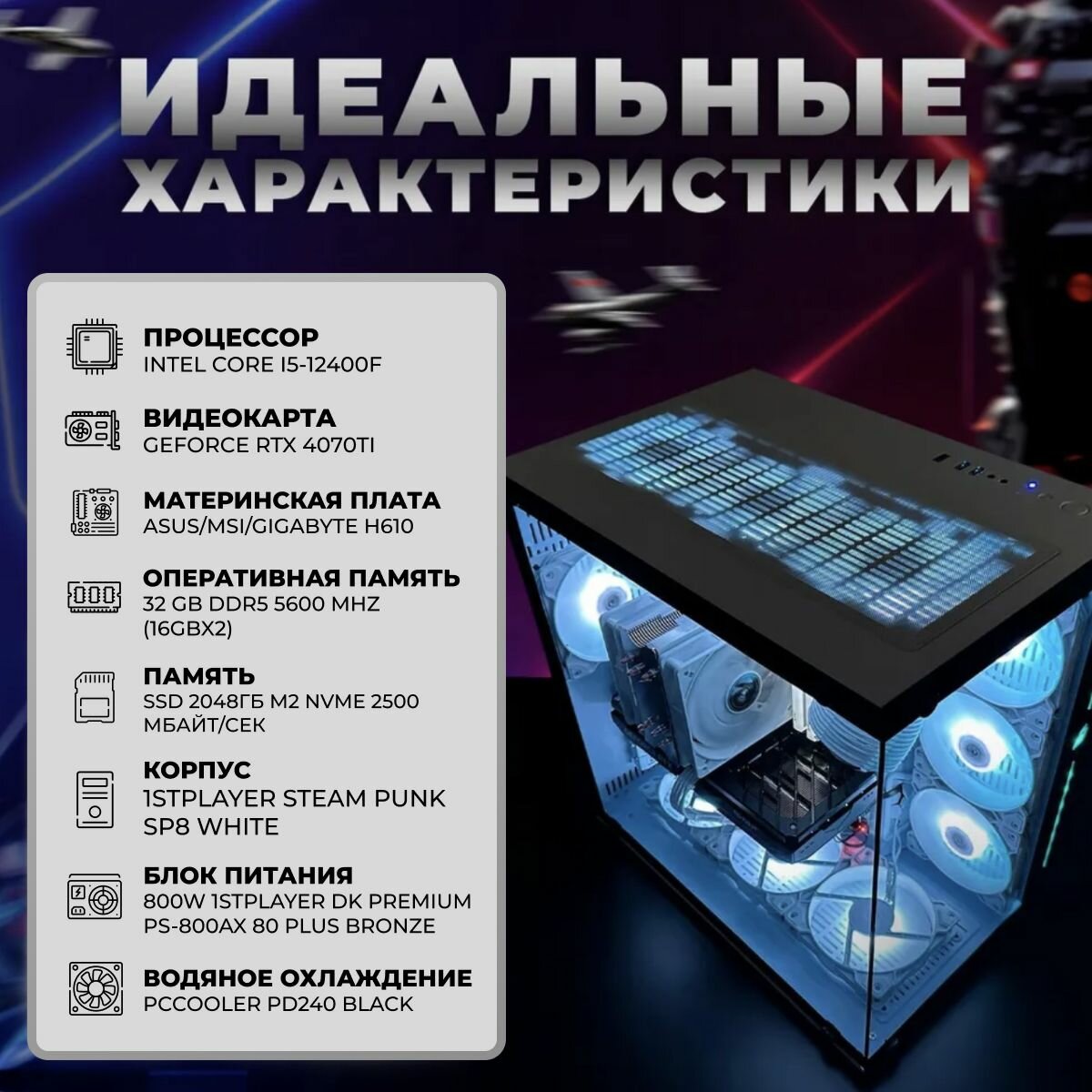 Технические характеристики: ✅ Процессор: Игровой компьютер компьютер (intel CORE-i5 12400f – высокая производительность для игр и работы. ✅ Видеокарта: RTX 4070Ti 12ГБ – отличная графика и высокая частота кадров. ✅ Оперативная память: ОЗУ 32 ГБ – моментальная загрузка и плавность работы. ✅ SSD: SSD 2TB SSD M2 SUPER) – быстрый запуск системы и игр.