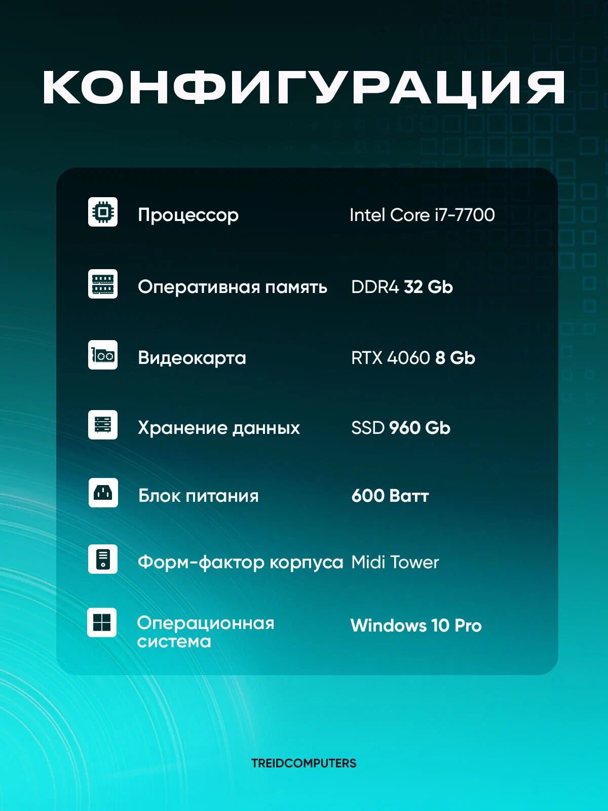 Системный блок TREIDCOMPUTERS Intel core i7 7700 3,6 (4 ядра)/ 32 Gb DDR4/ SSD 960 / GeForce RTX 4060 8 Gb - это мощный игровой ПК, который предназначен для тех, кто любит играть в игры высокого качества. Этот компьютер оснащен процессором Intel Core i7-7700, который обеспечивает быструю работу и высокую производительность при выполнении сложных задач.