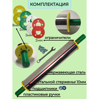 Скалка состоит: из рабочей части длинной 60 см, двух капролоновых ручек длиной по 10 см, двух шариковых подшипников, и прочного металлического стержня диаметром 10 мм.