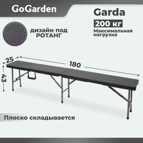 Лавочка - дачная романтика! На лавках можно весело разместиться за столом, отдохнуть на террасеили посидеть в уютном уголке сада. Лавка складная GARDA имеет сиденье цвета венге из водостойкого пластика с плетением под ротанг и складывается в плоский кейс с ручкой для переноски. Несмотря на изящный дизайн лавка выдерживает нагрузку 200 кгПрекрасно выполнена внутренняя поверхность лавки. Пластиковая защита ножек исключает царапины при использовании внутри помещения. Водостойкий пластик и стальная рама с антикоррозийным покрытием позволяют оставлять лавку на открытом воздухе в течение всего сезона. Дополните комплект лавок GRADA столом CAPRI арт.50361 бренда GoGarden