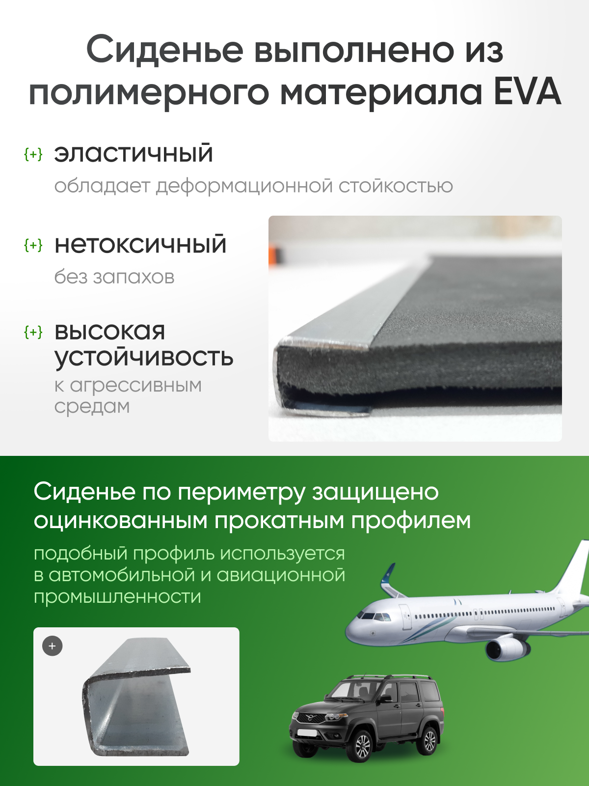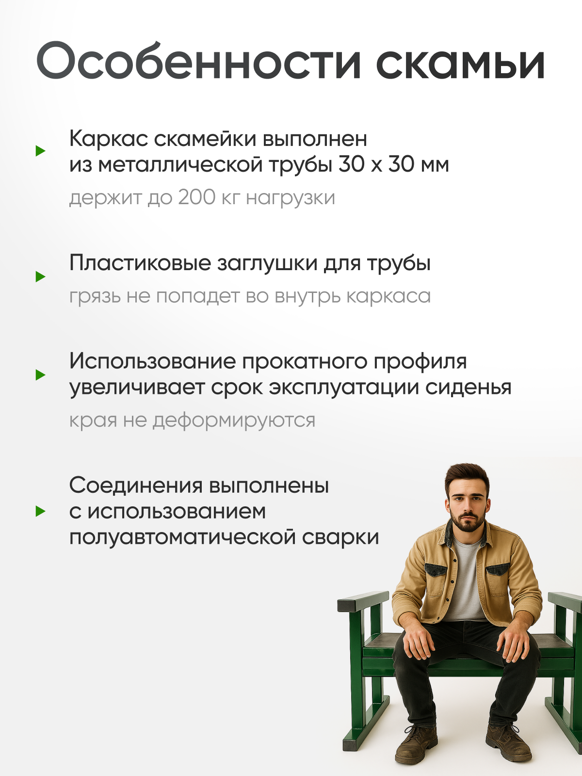 Благодаря грамотному подходу к проектированию данного изделия, каркас скамьи выполнен из профильной трубы 30х30 мм, что обеспечивает возможную нагрузку до 200 кг. Окантовка мягкого сидения выполнена с использованием металлического профиля, подобную технологию применяют при прокате профилей для авиационной отрасли. Подобный профиль сохранит мягкую обивку сиденья на протяжении всего срока эксплуатации.