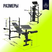 Скамья оснащена регулируемыми стойками и спинкой, которые позволяют настроить угол наклона от 0 до 45 градусов. Это позволяет адаптировать тренажер под индивидуальные потребности пользователя и обеспечивает комфорт во время тренировки.