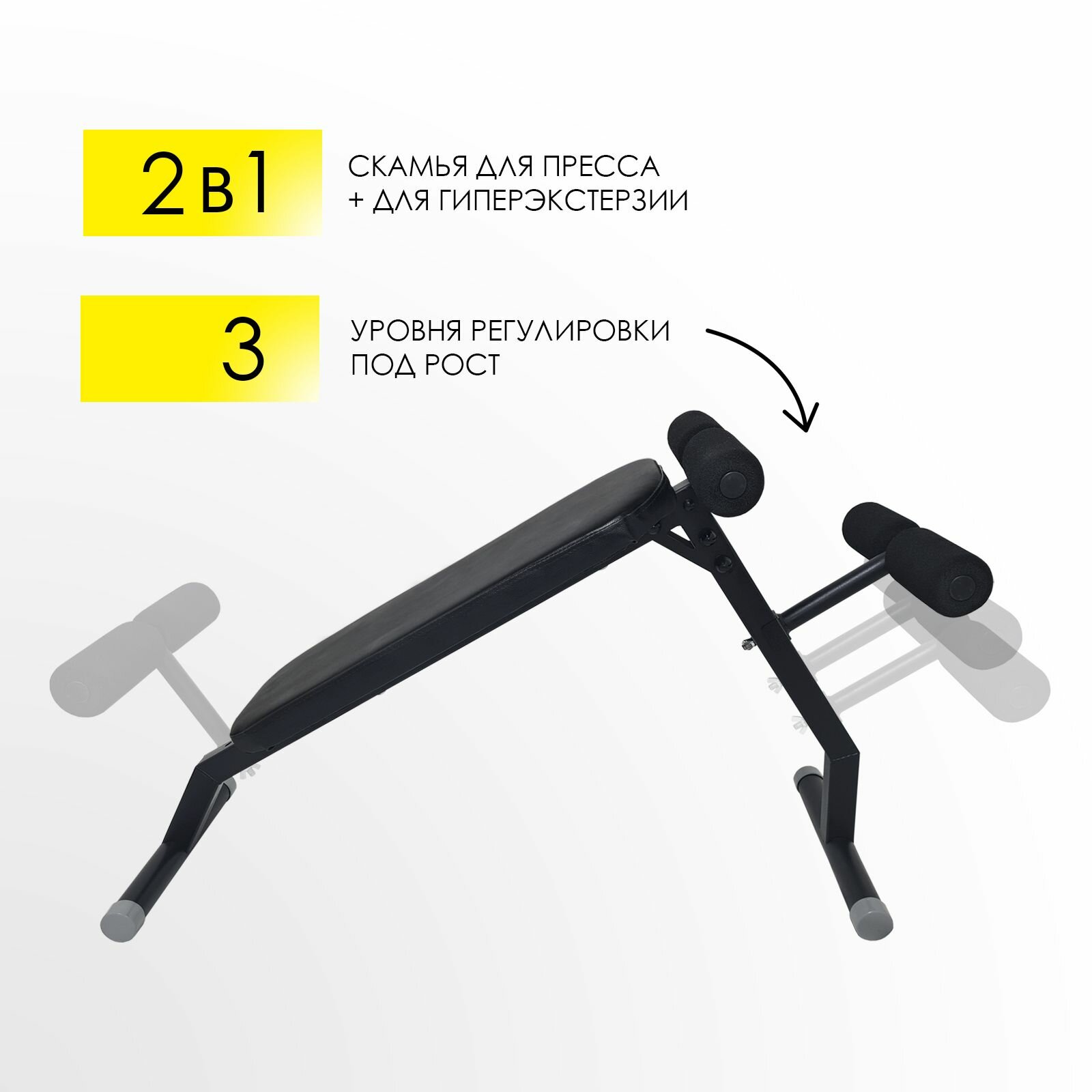 Скамья 2в1 , валик для упора ног переставляется на раме для упражнений на гиперэкстензию или пресса.