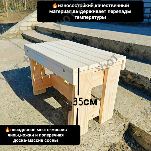 Здравствуй дорогой покупатель! Представляем вам мебель для вашей бани, парной, сауны, дачи, сада или огорода - деревянную складную лавочку. Эта скамейка изготовлена из натурального дерева липа, которое обладает сладковатым запахом и бактерицидными свойствами, а также совершенно безопасна для открытых участков кожи при использовании в бане. раскладная скамейка - лавочка с складными ножками будет отлично смотреться на вашей террасе или улице, а также может быть использована для отдыха на природе, пикника или для обустройства банного комплекса. Лавка полог необходимый аксессуар в бане для комфортного отдыха. Скамейка выполнена из липы, сосны. Мебель долговечна, не выделяет смолу, ее легко обрабатывать, имеет приятный аромат и красивый натуральный цвет. Скамейка поставляется в складном виде, перекладина в комплекте.