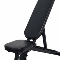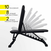Сиденье принимает 2 положения, Спинка - 7 положений. Благодаря этому, можно выполнять любые упражнения с гантелями и штангой. Рама скамьи имеет складной механизм для удобного хранения скамьи. Сиденье и спинка выполнены из экокожи и сверхплотного жесткого наполнителя. Возможно оборудовать стойками под штангу.