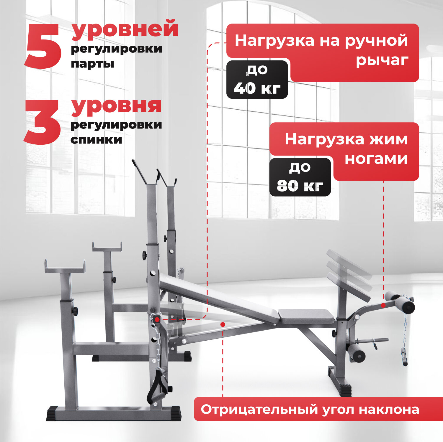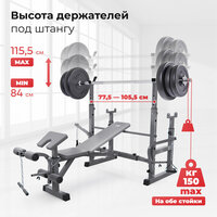 В комплект также входят съёмные валики, ручка для тяги на цепи и эспандеры на цепи, что позволяет разнообразить упражнения и повысить эффективность тренировок. Высота стоек под штангу варьируется от 84 до 115,5 см, а расстояние между стойками можно настроить под себя в диапазоне от 77,5 до 105,5 см.