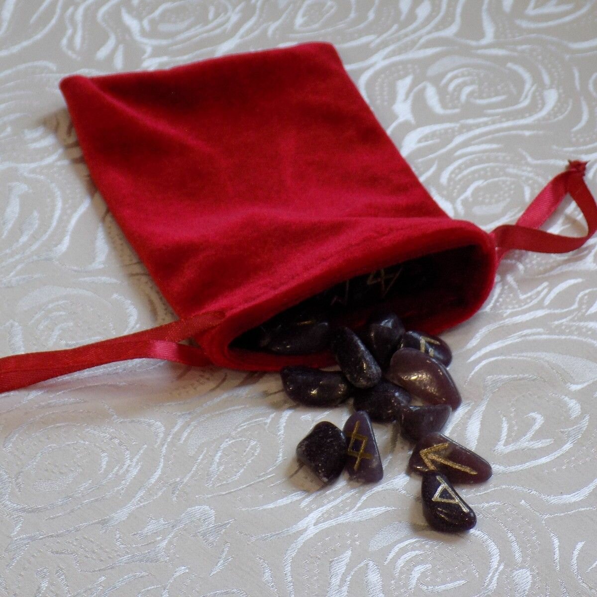 В комплекте: Скандинавские руны 25шт, красный бархатный (стрейч) мешочек, краткое руководство, тюбик с небольшим количеством краски для нанесения в случае повреждения защиты.