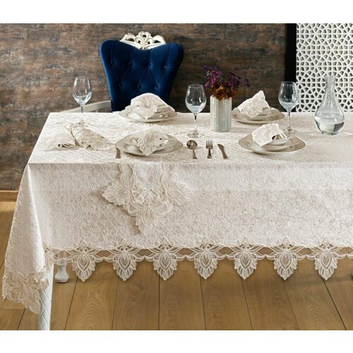 Скатерть размером 160x260 см и салфетки из набора "PETRANA" выполнены из высококачественного материала, что обеспечивает долговечность и легкость в уходе. Французское кружево, украшающее скатерть, придает изысканность и утонченность вашему столу, делая каждую трапезу особенной.