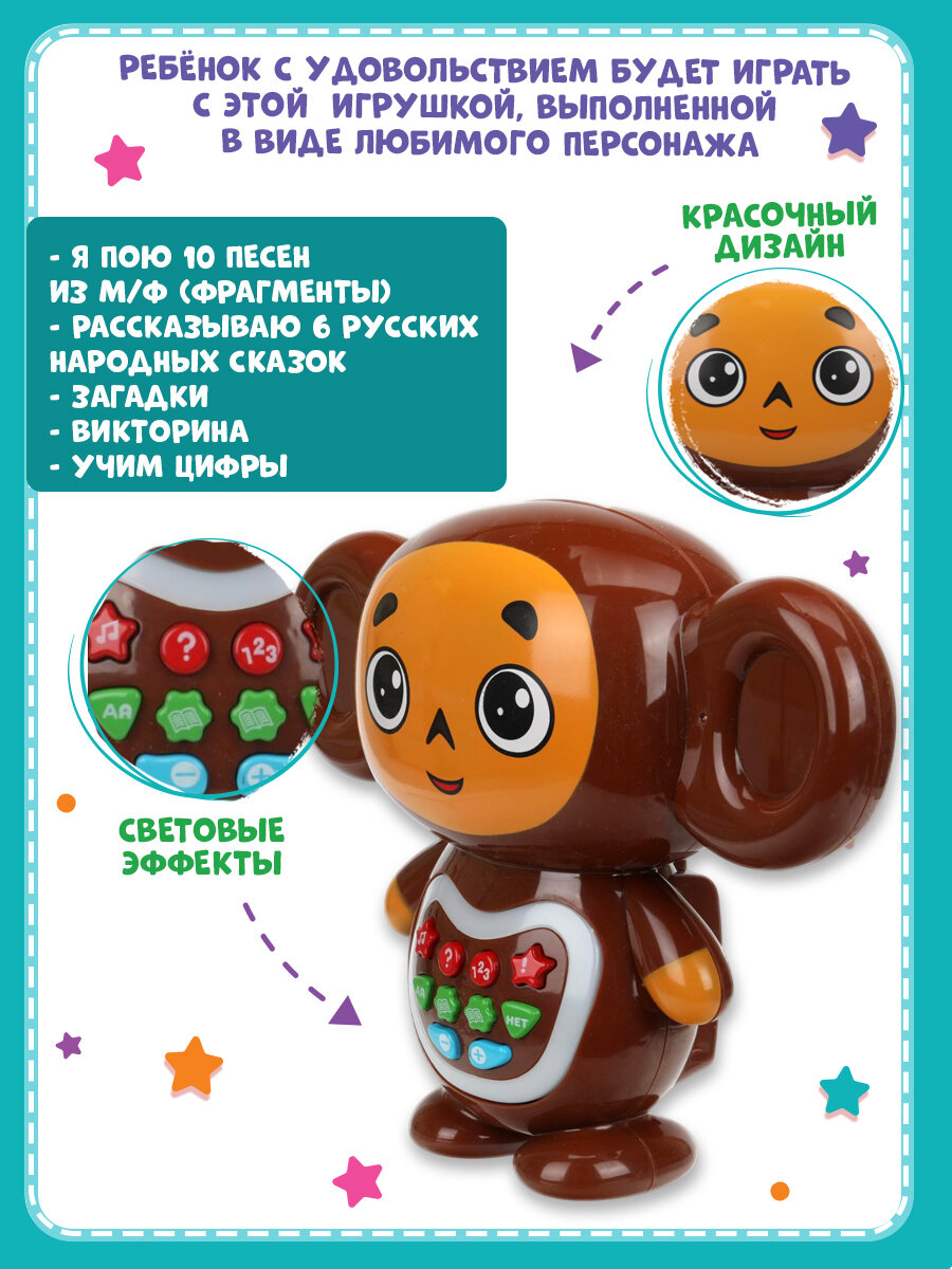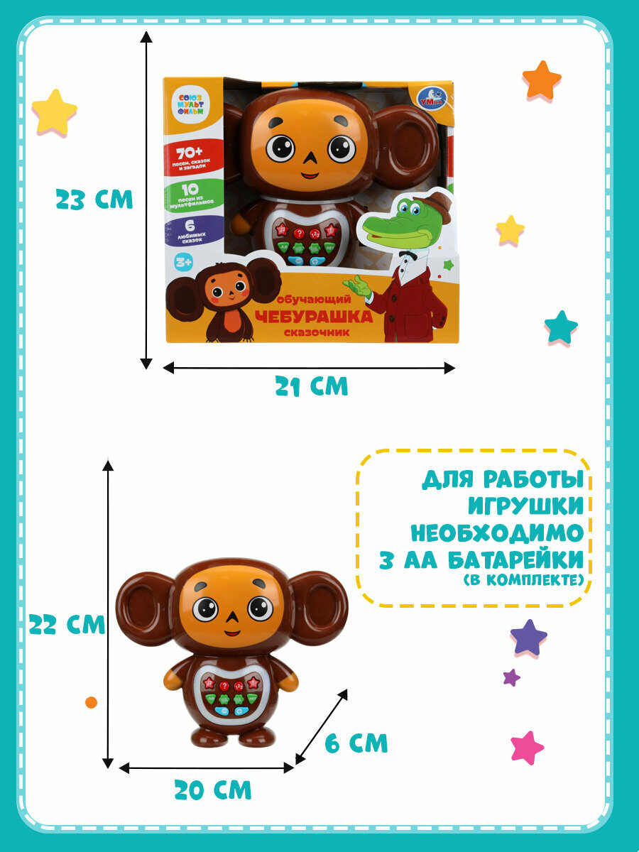 Чебурашка сказочник – это яркая развивающая игрушка, выполненная в виде персонажа советского мультсериала, любимого многими малышами. Эта развивающая игрушка со звуком и светом расскажет 6 русских народных сказок (Курочка Ряба, Три Медведя, Колобок, Репка, Теремок, Петушок - золотой гребешок).