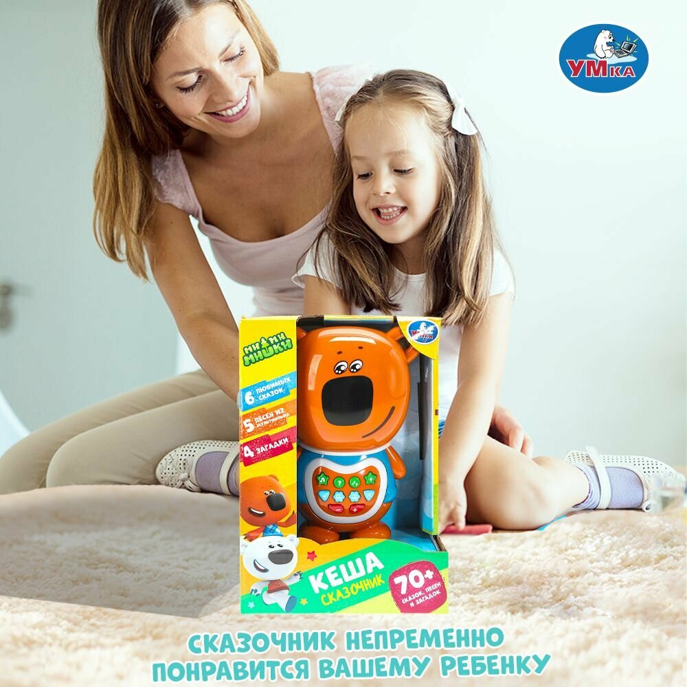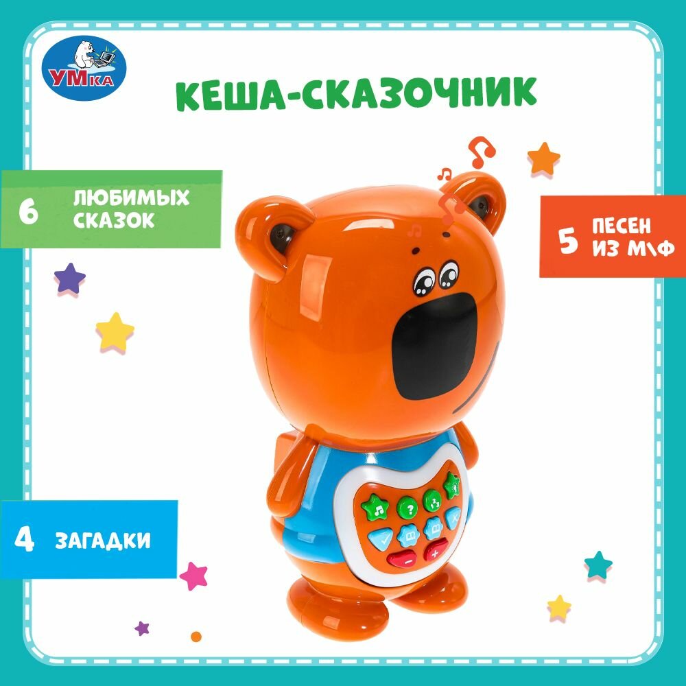 Развивающая игрушка Сказочник Кеша – это яркая развивающая игрушка, выполненная в виде персонажа популярного мультсериала, любимого многими малышами. Эта развивающая игрушка со звуком и светом расскажет 6 поучительных сказок, такие как: «Теремок», «Три медведя», «Волк и семеро козлят», «Петушок - золотой гребешок», «Зимовье зверей», «Три поросёнка» и сможет загадать 4 загадки, которые обязательно привлекут внимание вашего ребенка. Кеша развеселит малышей еще и пением песенок, вызвав на лице каждого ребенка улыбку и подняв ему настроение. Для активации интерактивных возможностей, на животике Кеши есть кнопки. Нажимая на них, малыш услышит 5 фрагментов из песенок: «Ми-ми-мишки», «104, 42.», «Ла-ла-ла», «Облака», «Песенка Тучки». Размеры музыкальной игрушки составляют 12 х 19 х 8 см. Это делает ее удобной для маленьких ручек. Выполненная из качественной пластмассы, безопасной для детского здоровья, игрушка-развивашка имеет долгий срок службы. Она работает от трех батареек типа ААА, которые уже входят в комплект. Говорящая игрушка будет интересна как мальчикам, так и девочкам. Она не только забавна, но и способствует развитию моторики и воображения детей. Увлекательные загадки помогут тренировать у ребенка логику и память. Светящаяся игрушка на батарейках непременно покорит сердца малышей, способствуя развитию воображения, расширению словарного запаса и открытию новых горизонтов.