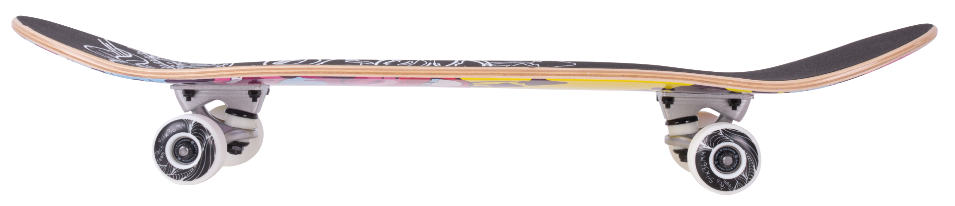 Колеса скейтборда оснащены подшипниками ABEC 7, обеспечивающими плавное и быстрое движение. Жесткость колес составляет 90 A, что гарантирует устойчивость и контроль над скейтбордом на различных поверхностях.