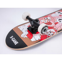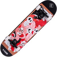 Скейтборд X-GAME - компании Tech Team. Подойдёт для катания по городу, а также паркам и другим местам. Принт деки порадует не только детей, но и взрослых. Этот скейтборд для новичков, кто безумно хочет научится первым навыкам трюков и катания . Дека изготовлена из девяти слоёв китайского клена, что гарантирует прочность и гибкость, выдерживает вес до 85 кг. Доска маневренная при поворотах и разворотах , за счет мягких бушингов (амортизаторы) стандарта жесткости 95А установленных на подвеске. Подвеска регулируется , а вместе с этим настраивается и маневренность доски. Колеса стандарта жесткости 95А, обеспечат плавную езду по пригодной, ровной дороге.