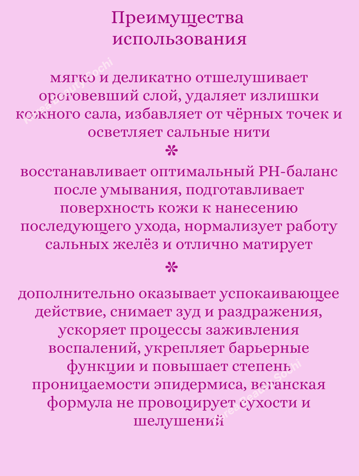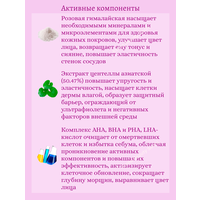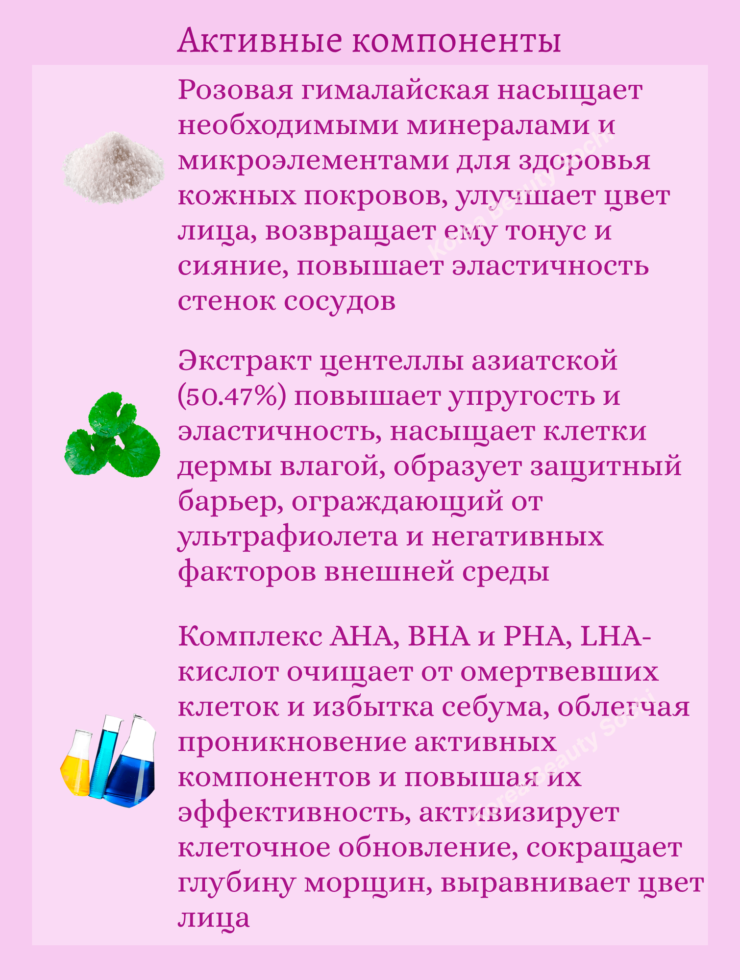 | Активный ингредиент | AHA-кислоты, PHA-кислоты, аденозин, аллантоин, бетаин, витамин B3 (ниацинамид), гиалуроновая кислота, кальций, коллаген, пантенол (провитамин B5), салициловая кислота, центелла азиатская |