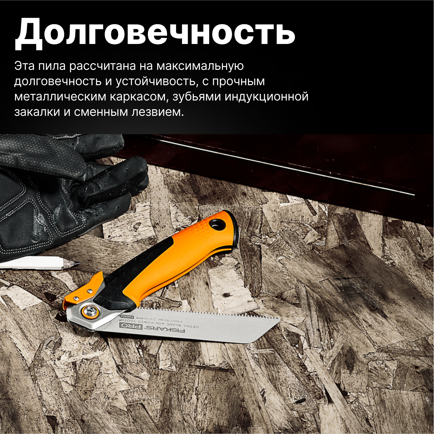 Отверстие для темляка обеспечивает удобство привязывания и хранения. Fiskars Pro Power Tooth Складывающиеся детали тяговой пилы сгибаются и фиксируются для превосходной защиты лезвия и безопасности без ущерба для производительности. Надежный механизм складывания предотвращает обнажение зубов и случайное раскрытие, когда они не используются. Тонкое лезвие 19 TPI обеспечивает превосходную точность и контроль для детальных и чистых резов. Гибкость для быстрого, легкого и чистого реза заподлицо. Компактный размер обеспечивает легкий доступ и идеально подходит для точных разрезов. Идеально подходит для использования на более мягкой древесине. Точки касания SoftGrip имеют инновационную текстуру, которая вытесняет влагу, предотвращает образование волдырей и обеспечивает нескользящую фиксацию.