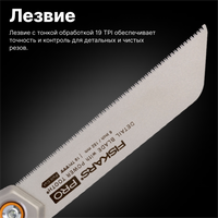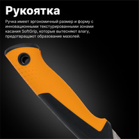 Ручка имеет эргономичный размер и форму с инновационными текстурированными точками касания SoftGrip, которые вытесняют влагу, предотвращают появление волдырей и обеспечивают нескользящий захват. Эта пила отличается максимальной долговечностью и устойчивостью, имеет прочный металлический каркас, зубья с индукционной закалкой и сменное полотно.