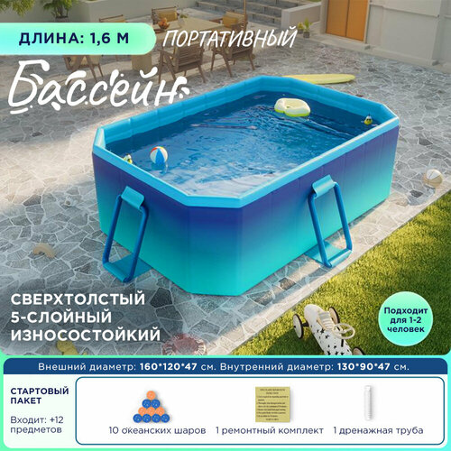 Бассейн имеет прямоугольную форму и размеры 1.6 метра в длину и 1.2 метра в ширину. В надутом виде его высота составляет 55 см.